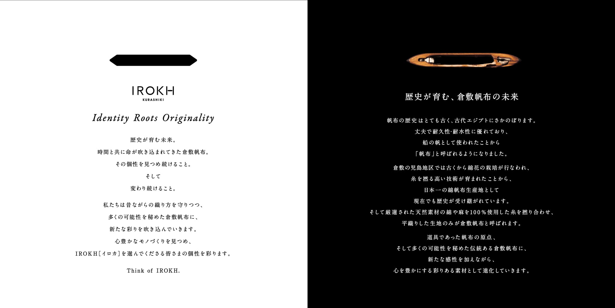 プロジェクト当初のネーミングはIROKA。帆布の安価で素朴なイメージではなく、色気、艶のあるブランドにということでこのネーミングで進んでいたのですが、色々なお話と想いを聞くうちに何か足りなさを感じていました。そのあと全然違うネーミング案なども多く再検討し、行き着いたのがこのIROKH。Identity・Roots・Originality ・Kurashiki Hanpu。と頭文字をとったネーミング。こういうものは直感で思ったことを重要視し、そこからロジック、想いに落とし込むと普通では思いつかなかったような「正しい答え」に繋がることが多いのはいつも面白いなぁと思います。