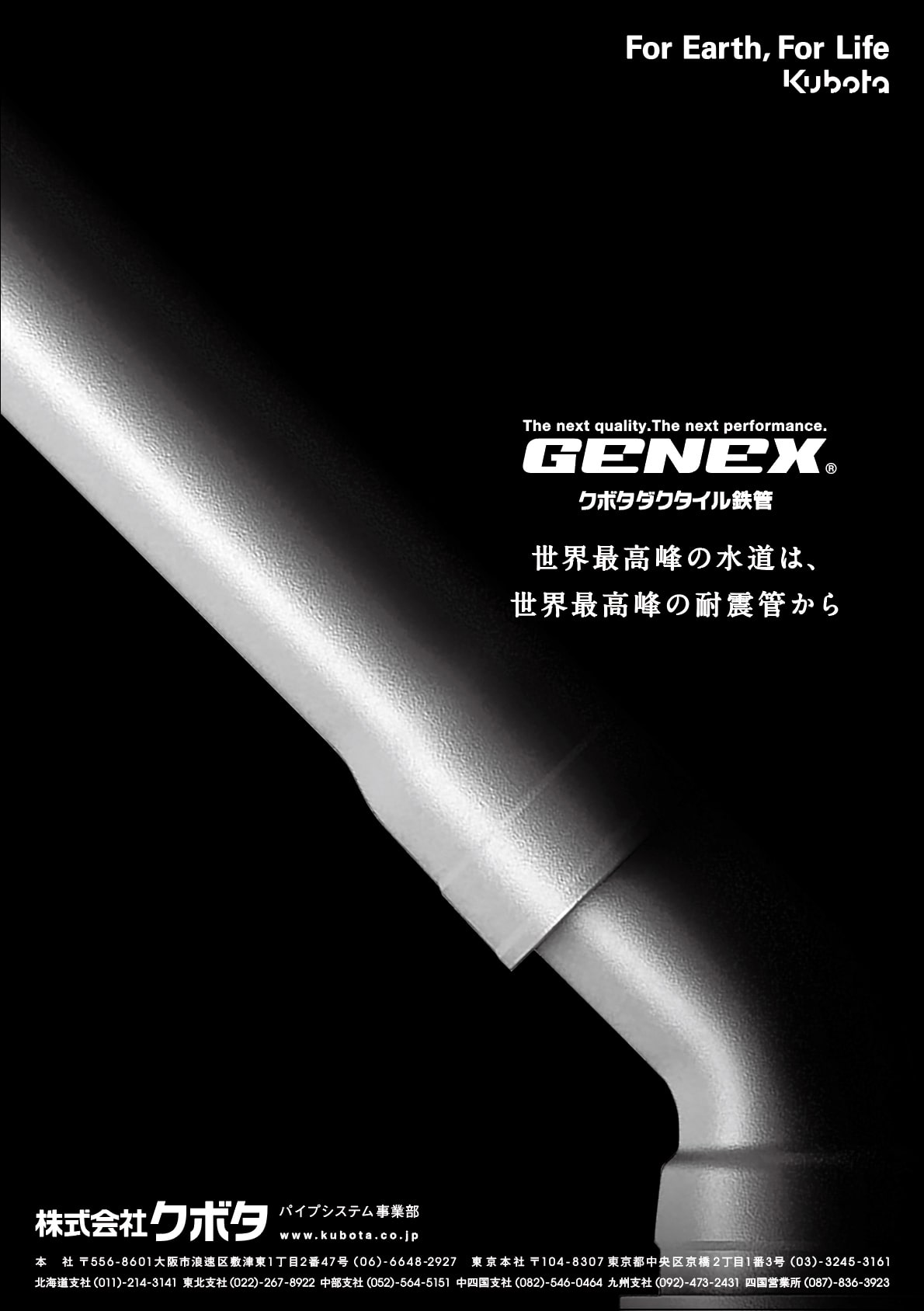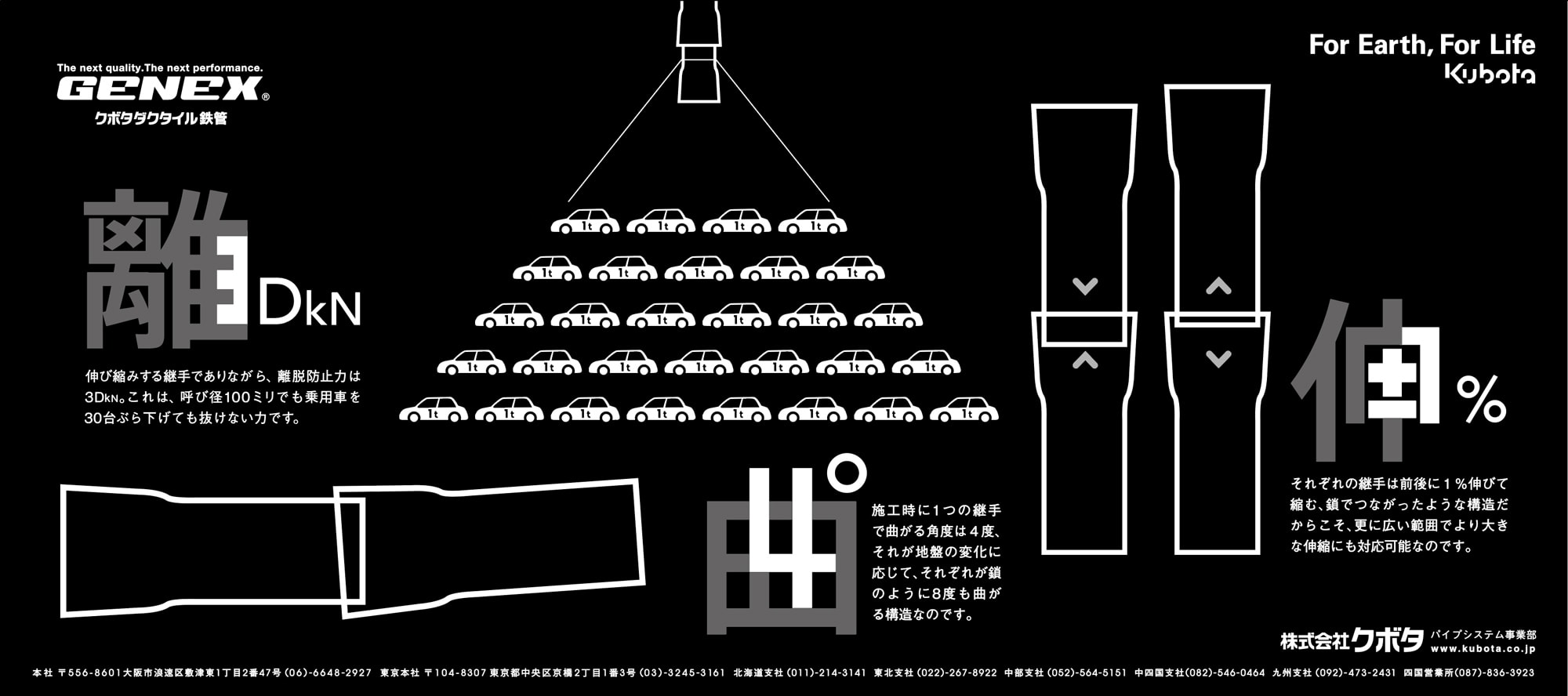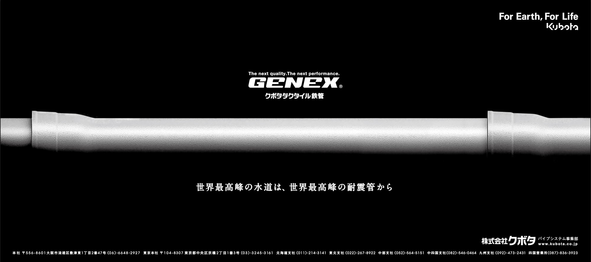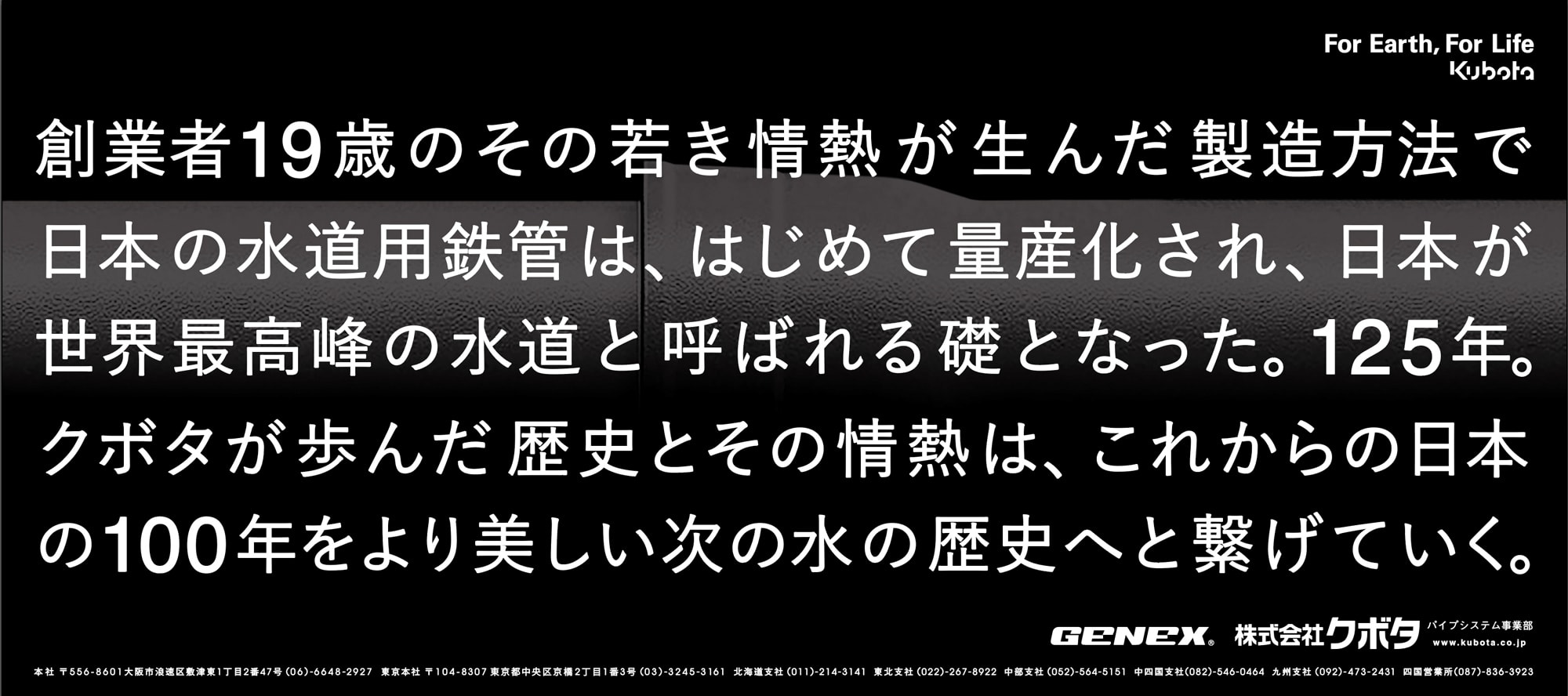蛇口をひねると水が出る。当たり前なのですが、その当たり前のために地中には多くの水道管が走っています。日本ではトップシェア、世界でもその機能を信頼されて使われているのがKUBOTAのダクタイル鉄管です。この鉄管を買うのは行政がほとんどですし、KUBOTAが作った鉄管を元に他の業者も製品を製作するので、グラフィックで何を伝えるのか、そこからのスタートでした。